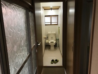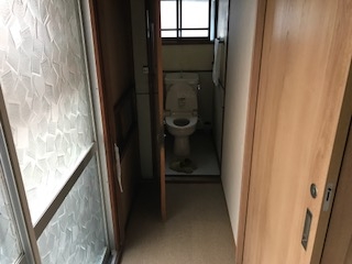 トイレが狭く暗かったので、奥行きを90センチ伸ばして壁クロス張替、床CF張替て、扉を新調、段違い天井に段違い照明。