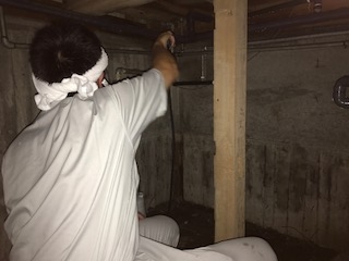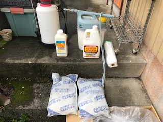 まずは、土壌消毒です。こちらは床下が高いのでやりやすかったですが、本来はうつ伏せにて施工します。土間、基礎立ち上がり、建物外回りの施工になります。