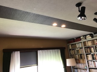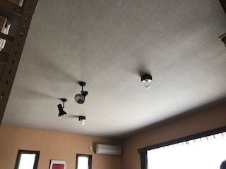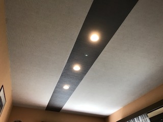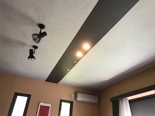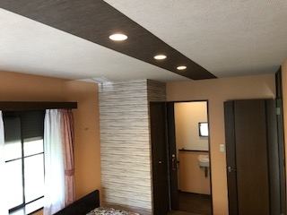 こちらがアフターです、天井クロスを梁に見立ててデザイン貼りして、照明をダウンライトにするだけで、こんなにも違った部屋に見えますd(^_^o) ホテルの一室みたいになりました