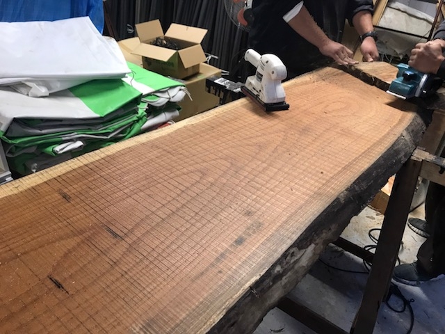 とても硬い材料なので表面を鉋がけできないので、ベルトサンダーにてヤスリ、塗装を施しました。