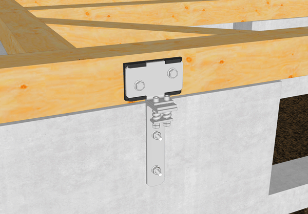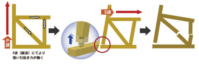 鉄筋筋交い 地震力を受けると、補強金物に加わった上下左右の力が桁や柱に伝達されます。仕口部分の木材は、補強金物によって一体化されているため、ほぞ抜けしたり折れたりすることはありません。 |