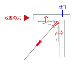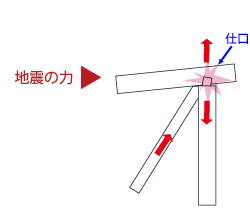 木の筋交い 木造の筋交いでは、地震力を受けると、桁と柱を押し上げる力が集中的に働きます。場合によっては、緊結が不十分な仕口部分で、ほぞ抜けしたり木材が折れたりすることがあります。 |