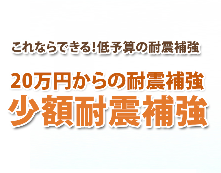 地震の第一波で建物の倒壊を防ぎ、その時に生き残ることを目的とした、必要最低限の耐震補強であればそれほど費用は髙くつきません。当社では「その時に生き延びる」ことを重点に置いた比較的安価な施工方法、「少額耐震補強」を採用しており、この方法であれば20万円から施工が可能で、通常に比べて1/10程度の費用で