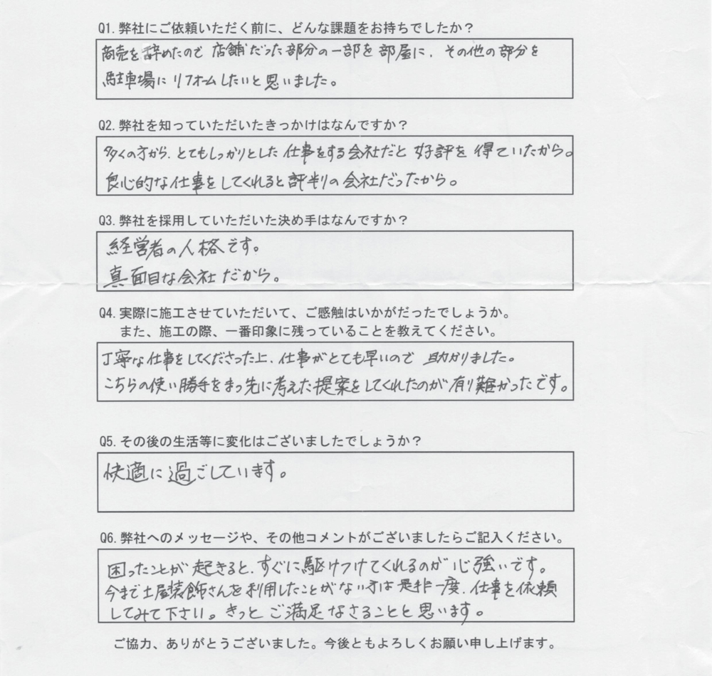 商売を辞めたので店舗だった部分の一部を部屋に、その他の部分を駐車場にリフォームしたいと思いました。